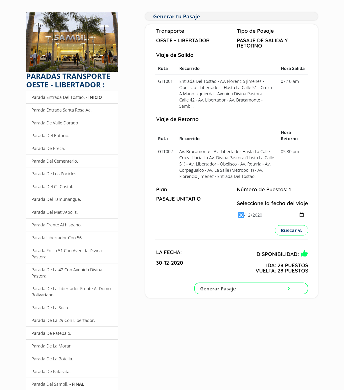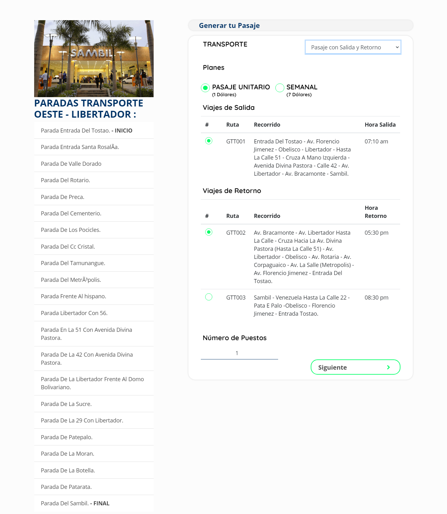 Paso Nro. 5: en este paso en el costado izquierdo podemos ver todas las paradas que realiza el transporte, y en el lado derecho escogeremos si nuestro viaje de salida, de retorno o ambas, y una vez que selecciones podemos optar por cada una los diferentes horarios de salida y retornos que nos ofrece la ruta al igual que podemos comprar un solo pasaje o apartar los 7 pasajes de la semana.