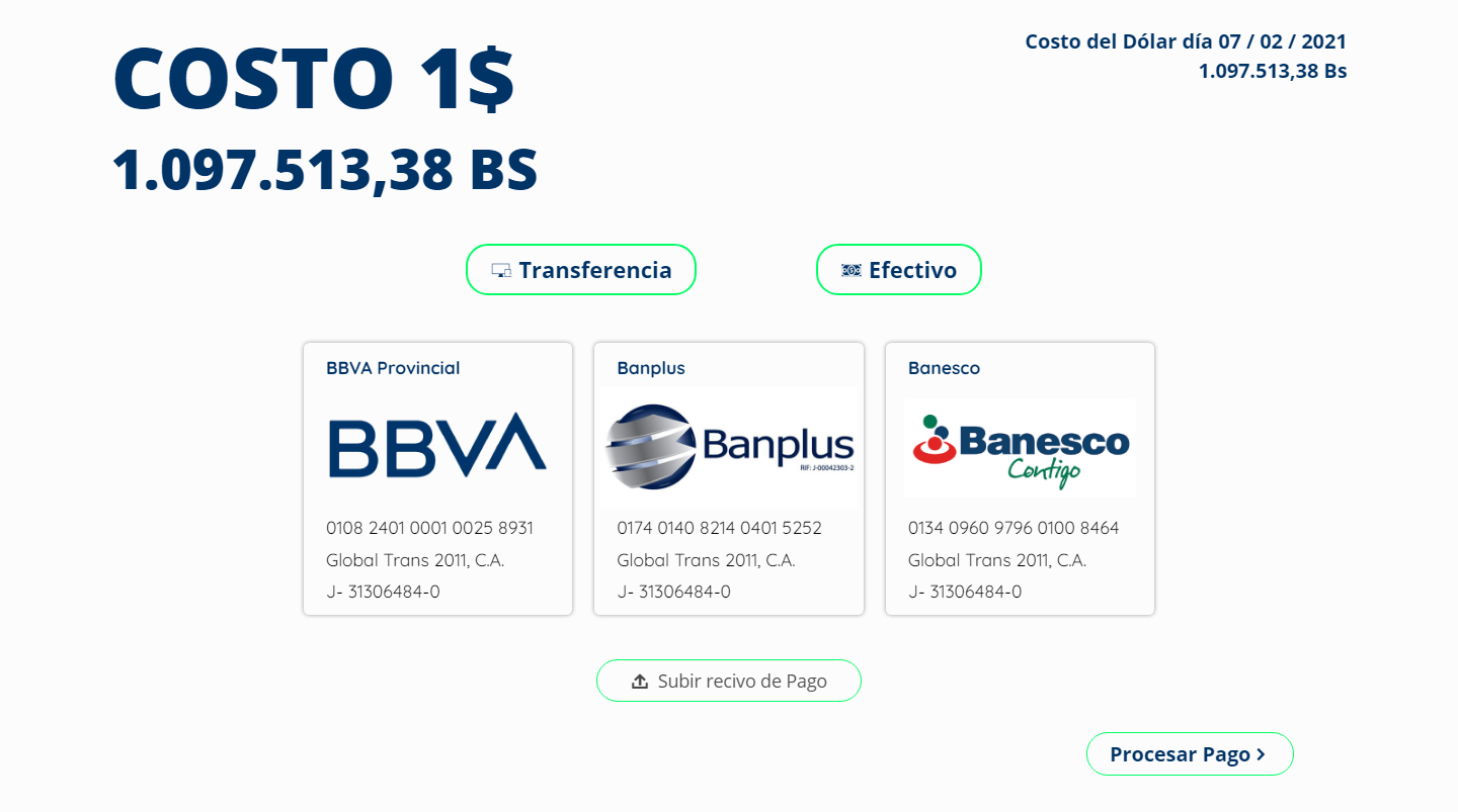 Paso Nro. 7: En el área de pago podemos optar por pago por trasferencia o en efectivo para ello hacemos clic sobre la opcion, en la opcion por transferencia nos muestra los banco en el que podemos pagar, realizamos la transferencia y subimos el bauche para que la empresa los pueda verificar, la opcion por efectivo solo los muestra el lugar y los dias que tenemos para cancelar el mismo, una ves selecionado el tipo de pago hacemos clic en procesar pago, en el caso de la transferencia es obligatorio subir el bauche para que sea verificada por la empresa.
