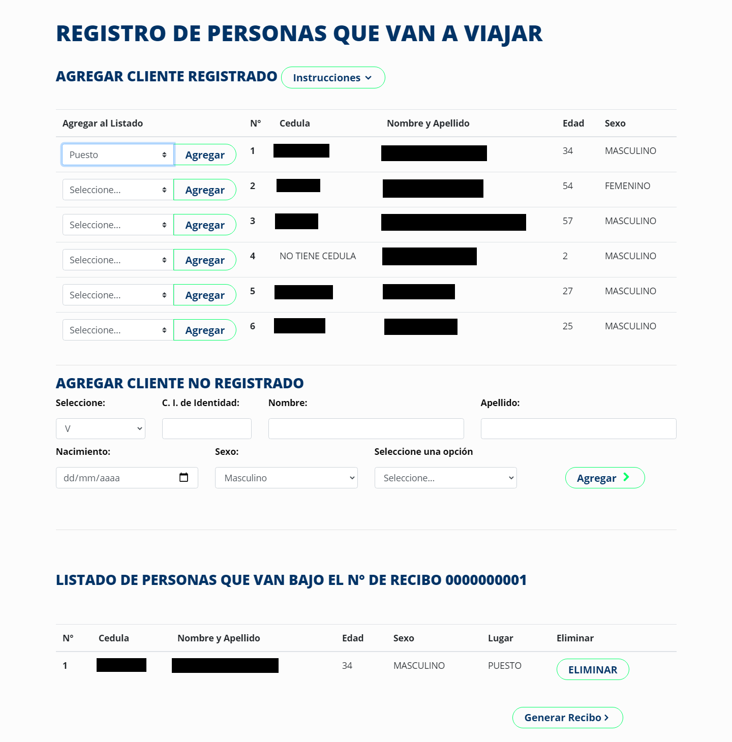 Paso Nro. 8: El paso siguiente es de igual importancia, es donde agregaremos las personas que irán en el transporte, si es usted solo se agrega usted solo, pero tiene la oportunidad de agregar otros pasajeros de acudo al número de puestos apartados. para ello tiene dos opciones la opción agregar clientes registrado como el caso de usted que al registrase para la cuenta ya se encuentra registrado y para agregar nombre a su puesto solo debe seleccionar una de las opciones, de puesto o en las pierna, para el caso de menores de cuatro años, pero también tenemos la opción cunado no se ha registrado, para ello llenamos los campos solicitados y hacemos clic en agregar, una vez agregado automáticamente en cliente registrado aparecerá para no repetir este paso en una próxima compra, los menores de 4 años pueden ir en las piernas pero deben ser igualmente registrado, y una vez que hallamos agregado los nombre de las personas que van en los puestos hacemos clic en generar recibo.