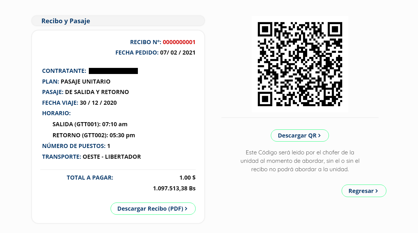 Paso Nro. 9: en este paso podemos descargar el recibo en PDF o el QR para mostrarlo al conductor para poder acceder al o los puestos apartados.