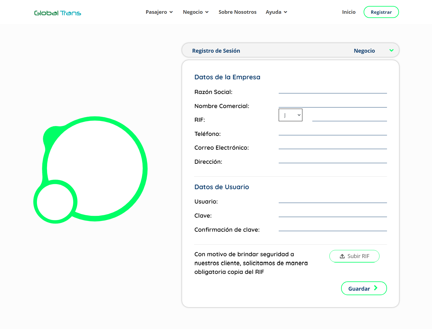 Paso Nro. 1: El primer paso es crearnos un usuario y contraseña, si ya lo tienes puedes saltarte este paso, para ello hacemos clic sobre el botón que dice registrar ahora nos dirigimos a donde dice "Registro de Sesión" y desplegamos el menus y hacemos clic en "Negocio" y posteriormente llenamos cada uno de los campos requeridos al igual que es necesario subir el RIF. y por ultimo hacemos clic en guardar