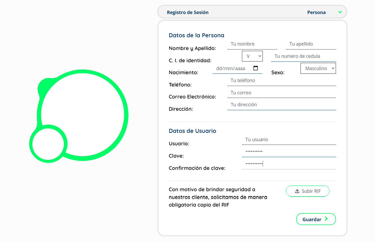 Paso Nro. 1: El primer paso es crearnos un usuario y contraseña, si ya lo tienes puedes saltarte este paso, para ello hacemos clic sobre el botón que dice registrar y llenar cada uno de los campos requeridos al igual que es necesario subir el RIF. y hacemos clic en guardar
